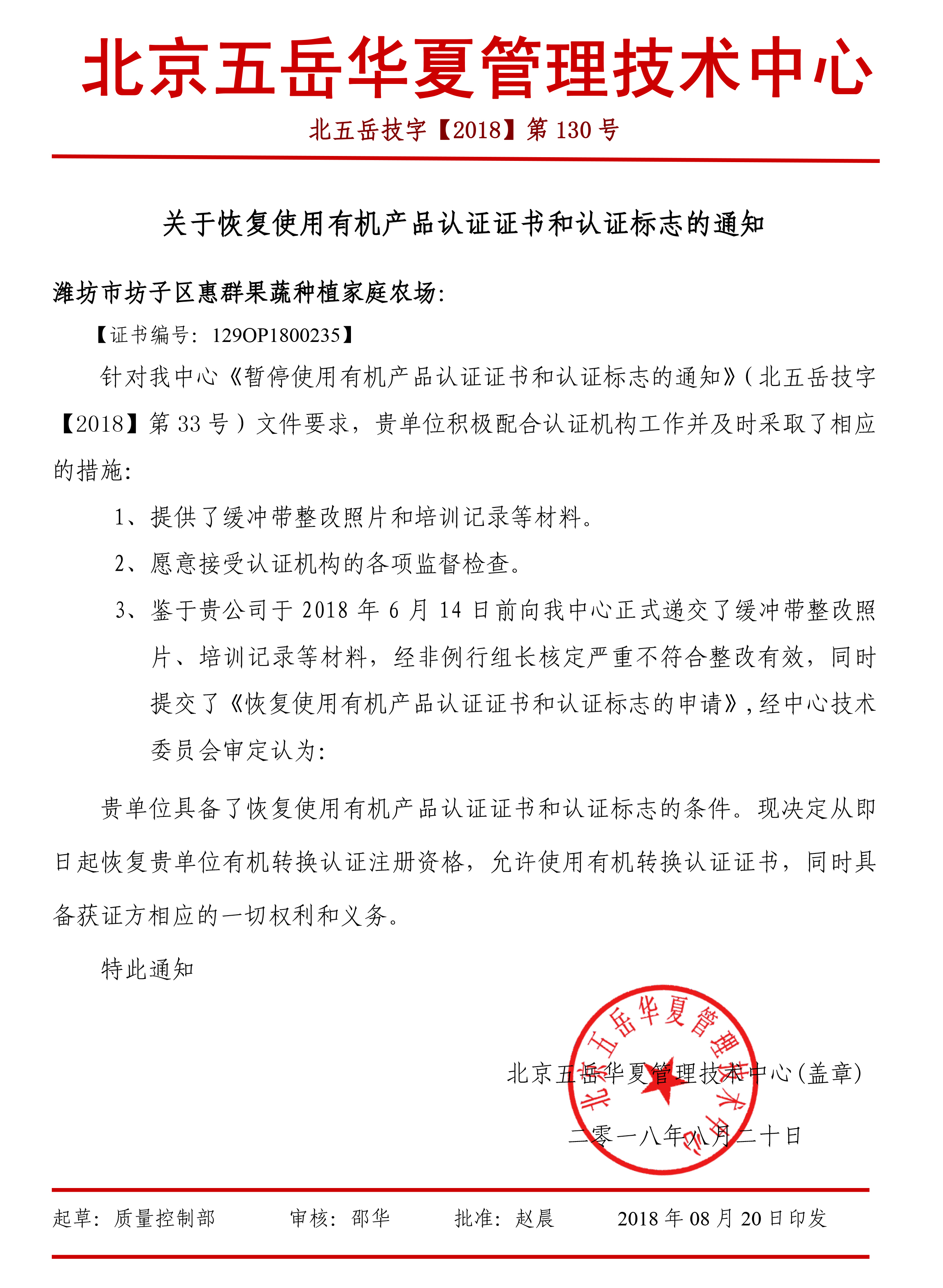 关于恢复潍坊市坊子区惠群果蔬种植家庭农场有机产品认证证书和认证标志的通知