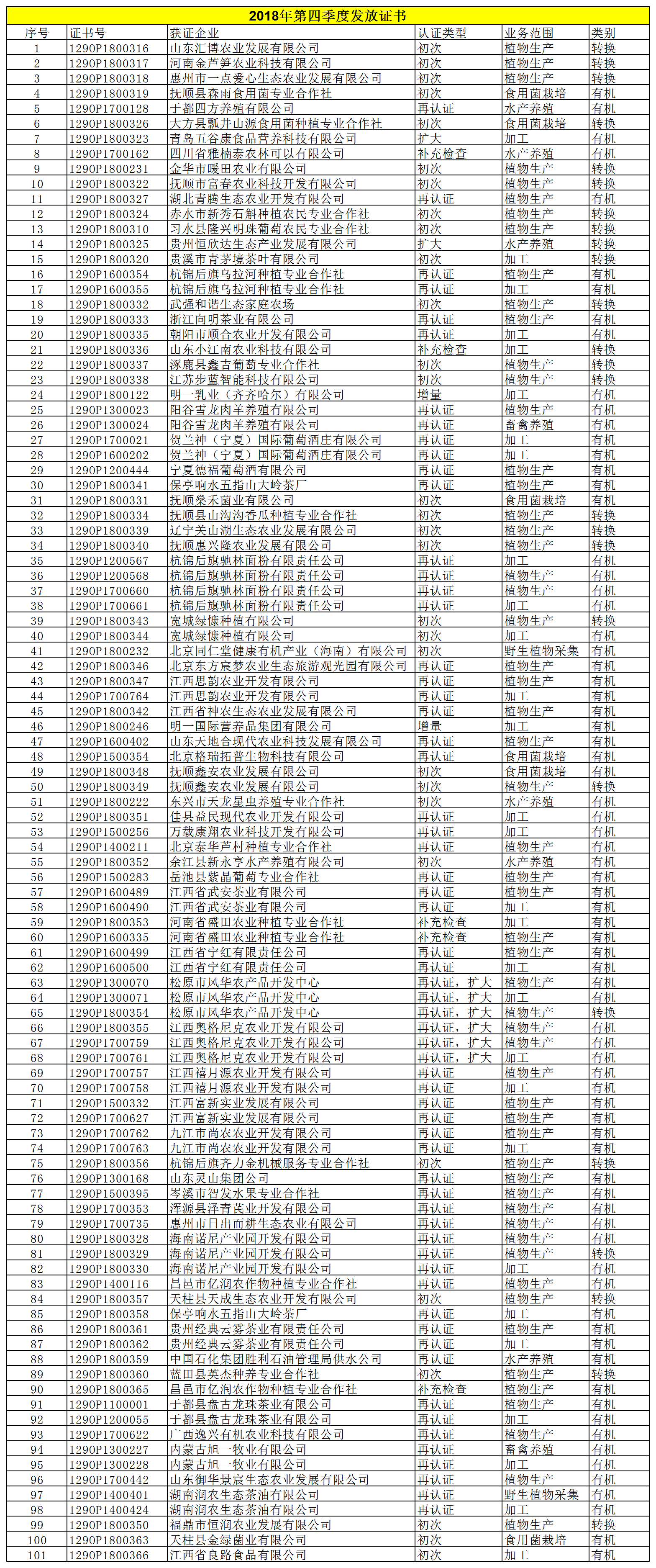 2018年第四季度发放证书